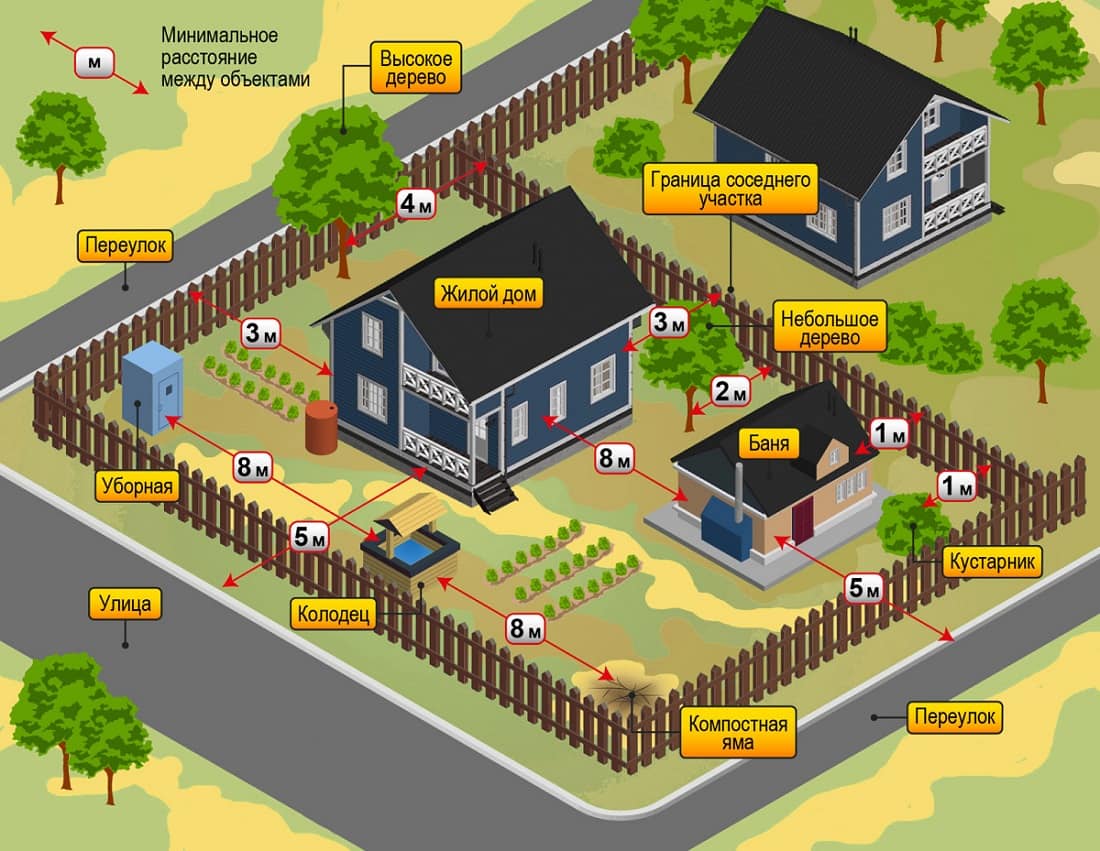 Удаленность расположения различных построек также строго регламентирована (причем, как для строений в пределах одного участка, так и для соседних):